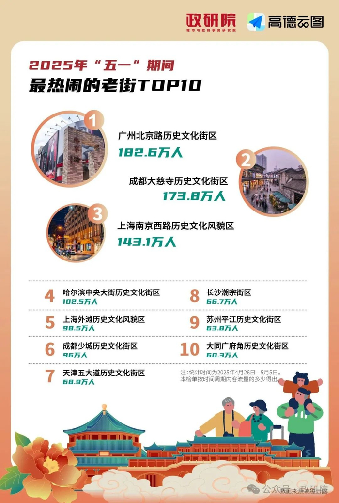 如果单纯以老街在2025年4月26日0时起—5月5日24时这一时间段内的绝对人数为观察窗口,在我们考察的116个历史文化街区中,广州北京路是“五一”期间最为“沸腾”的老街,其游客数量达到182.6万人;成都大慈寺、上海南京西路紧随其后,其游客数量也超过了百万人。