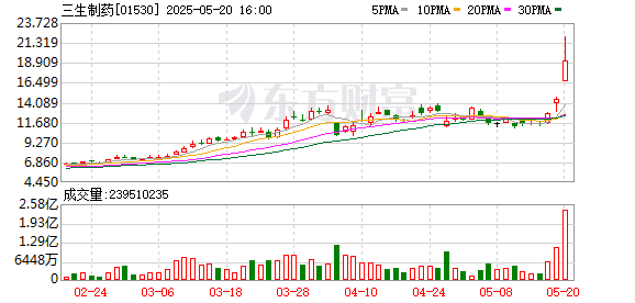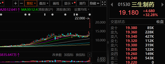 今天港股盘面上最靓的仔非三生制药莫属。三生制药高开后持续拉升,早盘暴涨40%,最高22港元,创历史新高。随着辉瑞、诺和诺德、默沙东等巨头加大投入,中国药企的“出海”步伐逐步加快。Citigroup分析师将3SBio目标价从13港元提升至21港元,市场对中国创新药的信心明显增强。