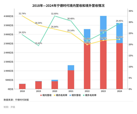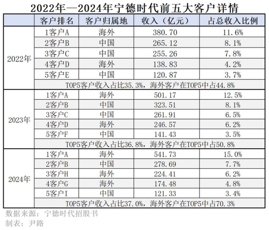 海外市场已经成为宁德时代的关键增长极,2018年—2024年,其境外营收从不足10亿元增至千亿元以上,远超境内营收增速。到2023年,境外营收占比稳定在30%以上,且2020年之后境外业务毛利率持续超出境内业务5个百分点左右。2024年,宁德时代前五大客户中海外客户已占据三席。