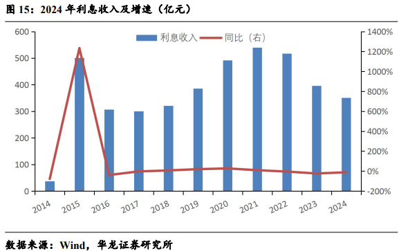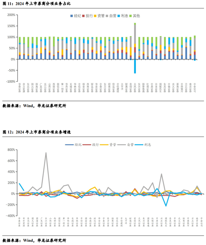 从业务结构看,2024 年自营业务成为核心增长引擎,贡献收入占比35%,经纪业务受益于市场活跃度提升占比21%,资管业务保持稳定(占比 9%),投行业务和利息业务则因政策调整及市场波动承压,分别占比6%和 7%。