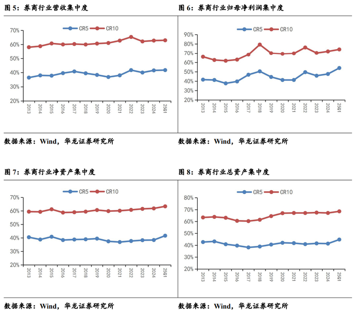 2024 年头部券商优势进一步提升,无论业绩情况以及资产规模均呈现集中度提升态势,同时 CR5 相比较 CR10 集中度提升幅度更快,监管推动下行业并购重组将持续进行,在行业标的合并的背景下,行业集中度的提升趋势有望延续。