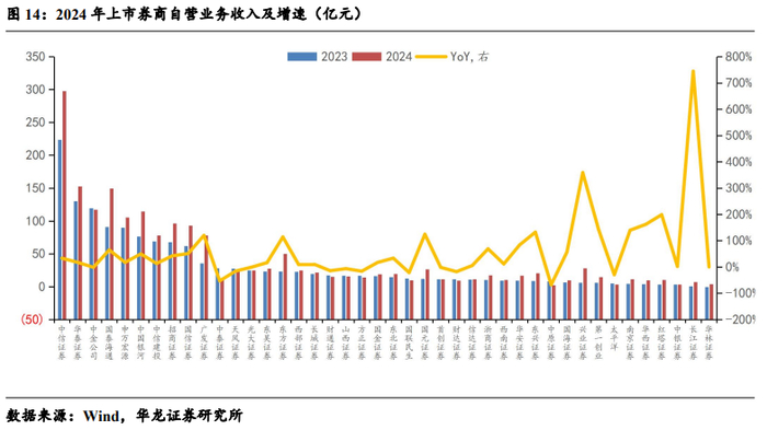 2024 年 42 家上市券商总体自营业务合计收入1789 亿元,同比上升32%,其中头部券商占据主导地位,中信证券以298 亿元自营收入居首,华泰证券 153 亿元、国泰海通 149 亿元紧随其后。中小券商弹性突出,债券及权益配置或为增长主因,长江证券增长744%,红塔证券增长199%,华林证券扭亏为盈,头部券商注重非方向性投资及衍生品策略,中小机构则偏重单边行情。