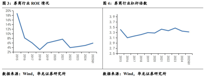 证券行业 2024 年 ROE 水平为 4.97%,同比提升0.43 个百分点,2025年一季度提升至 5.94%。2024 年杠杆率由2023 年的3.46 倍下滑至3.35倍。受债券市场强劲影响、以及股市三季度末以来波动上行,上市券商自营投资净收益同比增长较快,成为推动 ROE 提升的重要因素。