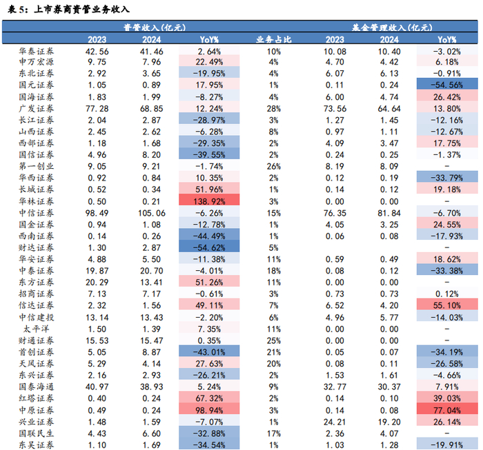2024 年资管业务收入 441 亿元,同比2023 年持平,中信证券(105亿元)广发证券(69 亿元)华泰证券(41 亿元)等头部机构收入居前。中小券商分化显著,南京证券(111%)、财达证券(120%)增速领先,部分中小券商增速位居上市券商末尾。随着资管新规的逐步落地,券商资管业务在去通道、主动管理转型方面取得了显著成效。券商通过加强投研团队建设,提升产品创新能力,实现了资管业务的稳健增长。券商在产品创新和客户服务方面不断发力,进一步提升了资管业务的竞争力。资管业务的增长得益于券商在主动管理转型和产品创新方面的努力,未来将继续朝着专业化、多元化的方向发展。