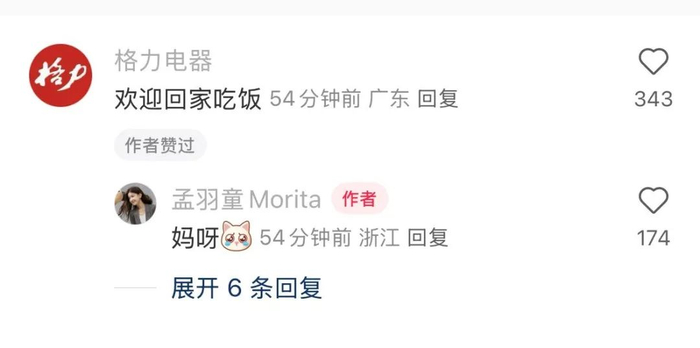 另据多家媒体报道,孟羽童该条“时隔两年,收到了前老板的微信”的页面下,有一名为“格力电器”的用户回应“欢迎回家吃饭”,并得到孟羽童本人回应。