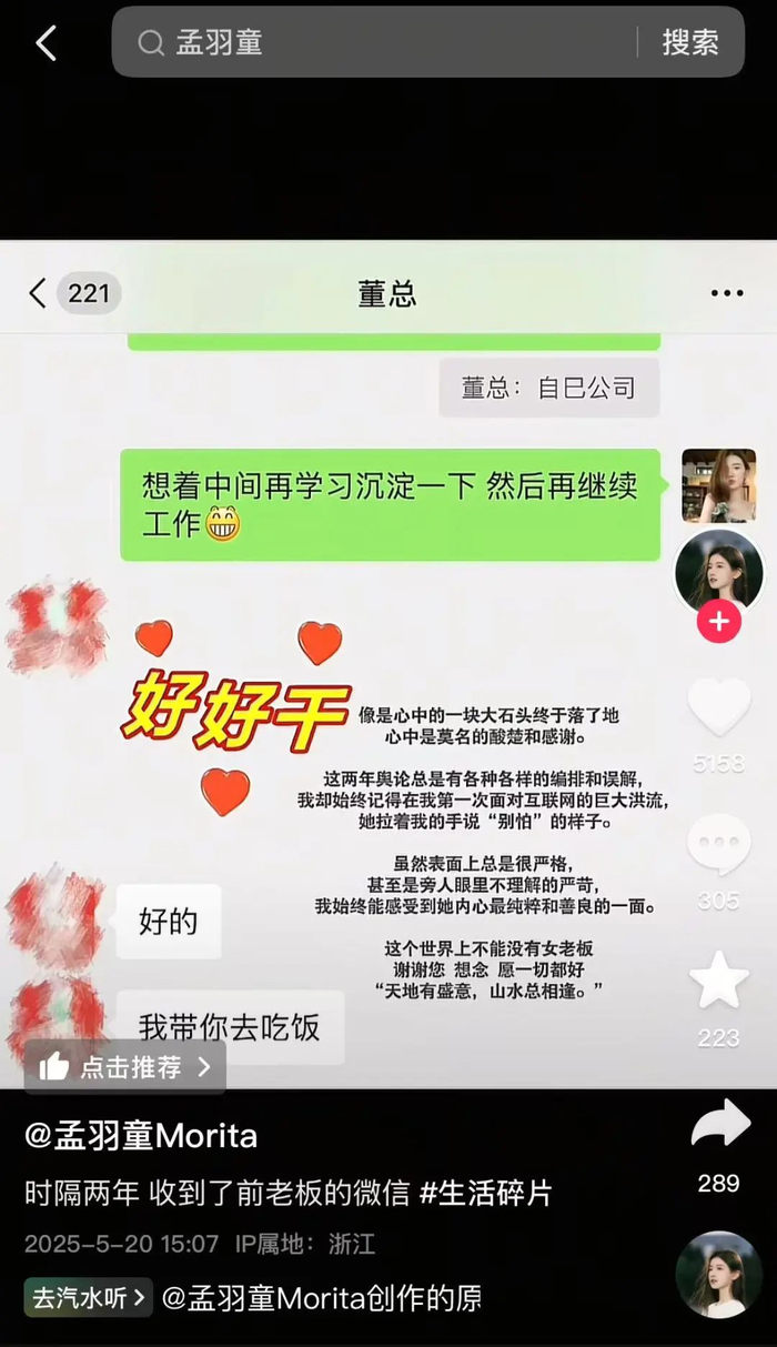 图片显示为孟羽童和一备注为“董总”的用户的聊天记录,孟羽童在图片上附文称,“像是心中的一块大石头终于落了地,心中是莫名的酸楚和感谢。这两年舆论总是有各种各样的编排和误解,我却始终记得在我第一次面对互联网的巨大洪流,她拉着我的手说‘别怕’的样子。虽然表面上总是很严格,甚至是旁人眼里不理解的严苛,我始终能感觉到她内心最纯粹和善良的一面。这个世界上不能没有女老板,谢谢您,想念,愿一切都好。‘天地有盛意,山水总相逢’。”