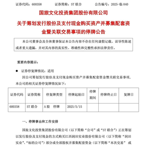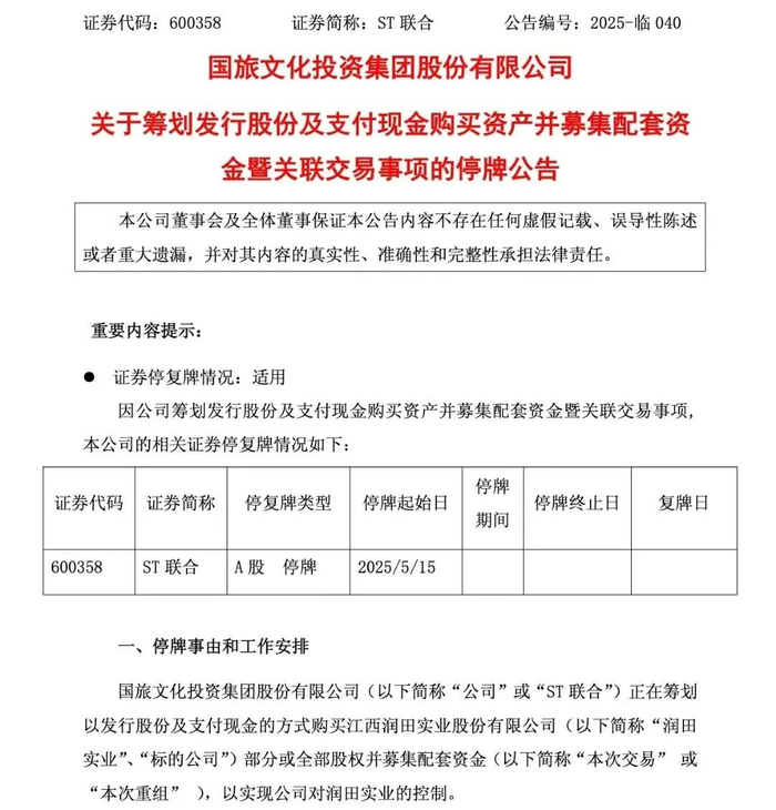 日前,国旅文化投资集团股份有限公司(ST联合,原国旅联合)发布公告,公司正在筹划以发行股份及支付现金的方式购买江西润田实业股份有限公司(以下简称“润田实业”)部分或全部股权并募集配套资金,以实现公司对润田实业的控制。公司股票自2025年5月15日起停牌,预计停牌时间不超过10个交易日。本次交易预计构成重大资产重组,不会导致公司实际控制人变更,不构成重组上市。