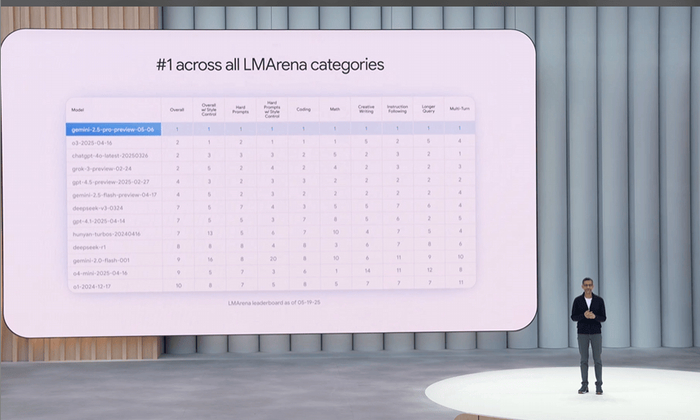 今年3月Gemini 2.5 pro正式发布,此次大会上Gemini2.5有了新的升级。更新后的2.5pro凭借其100万个token上下文窗口,拥有一流的长上下文和视频理解性能,目前2.5pro在WebDev Arena与 LMArena 排行榜中位列第一。