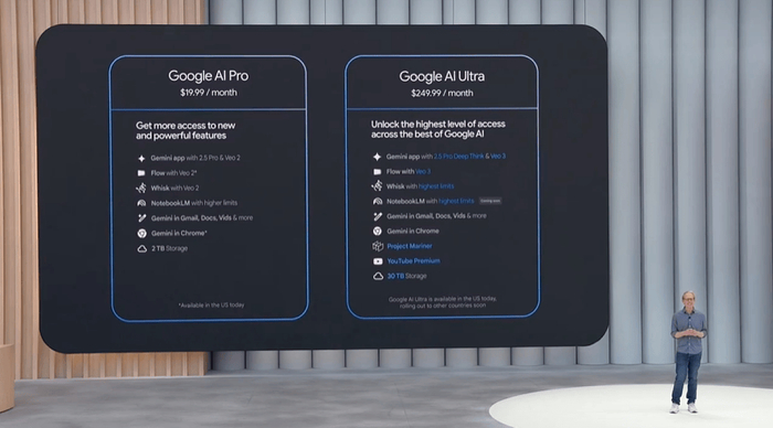 目前谷歌推出两种订阅服务:Google Al Pro 和 Google Al Ultra。Google Al Pro价格为每月19.99 美元,除了包含之前Gemini Advanced套餐的内容还包括Flow、NotebookLM 等产品。Google AI Ultra目前仅在美国提供,后续将逐步在更多国家/地区推出,每月费用为 249.99 美元,能够享受Google AI的全部服务与产品。