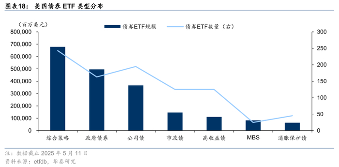 海外成熟市场如美国,债券ETF发展起步早且规模庞大。其拥有丰富的策略品种,包括综合债、公司债、政府债、地方债、通胀保值、抵押担保等十种类型,且各类型下产品数量众多,久期分布也比较均衡。而我国内地第一只债券ETF发行于2013年,截至2024年年底,国内债券ETF占ETF总规模比例仅2%,占债券型基金比例不足2%。这表明我国债券ETF市场目前仍处于初级阶段,与海外相比存在较大的差距,同时也意味着有广阔的发展空间等待开拓。