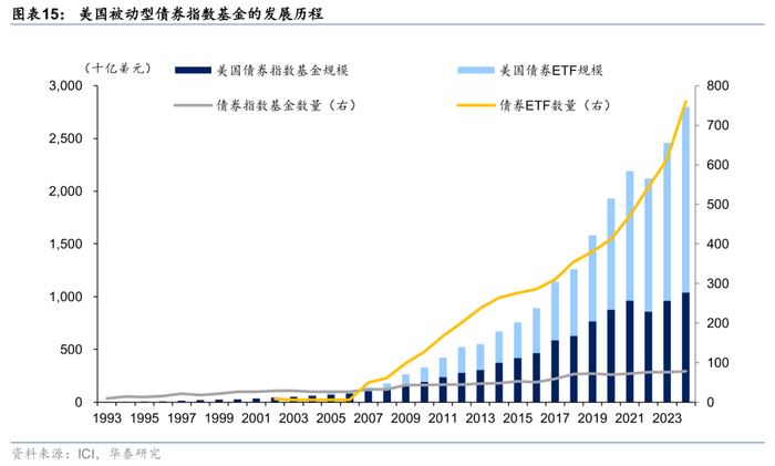 2008年金融危机以来,美国被动型债券指数基金快速增长,债券ETF规模数量双高增。被动型债券指数基金占全部债基比例由2008年的8%,快速增长至2024年的41%。其中,债券ETF规模和数量快速增长,美国债券ETF规模由2008年的不足600亿美元,快速增长至2024年的1.50万亿美元,规模增长超20多倍,年均复合增速达到24%。债券ETF数量从2008年的62只,增长至2024年的760只。