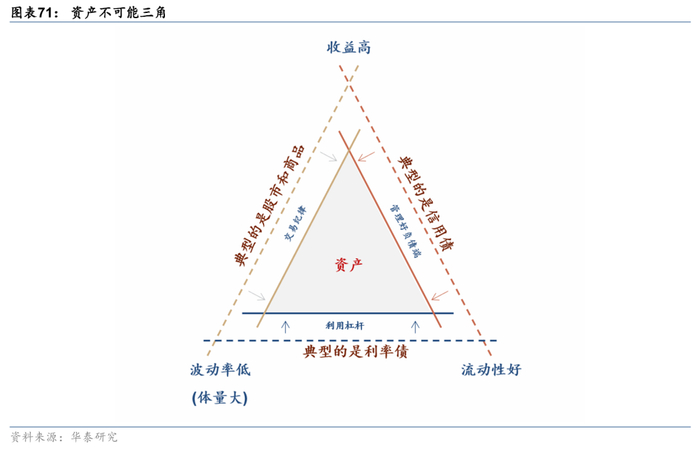 大量研究表明,资产配置决定了一个投资组合波动的90%甚至更多,这充分说明了大类资产配置在现代投资组合管理中的基石地位。而且,投资单一资产面临“不可能三角”。由于资产属性的差异,投资者投资单一资产时,在低风险、高收益、高流动性之间往往难以兼顾,存在“不可能三角”。例如:①低风险且高收益的资产,一般流动性就不会太好,比如结构化产品或者曾经火爆的非标产品等。②低风险且高流动性的资产,一般收益也不会太高,比如货币市场基金、利率债等。③高流动性且高收益的资产,一般需要承担较高波动,比如股票、商品期货等。