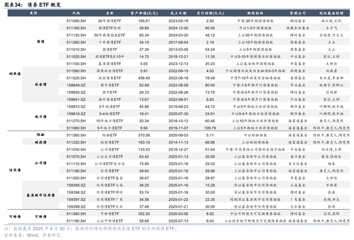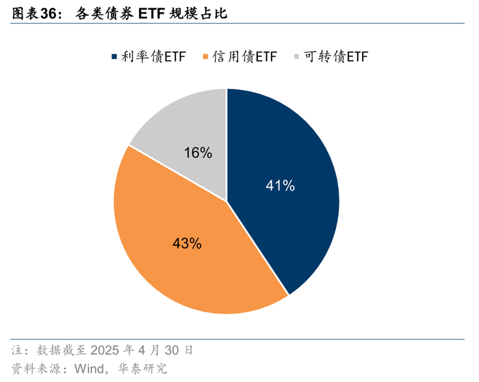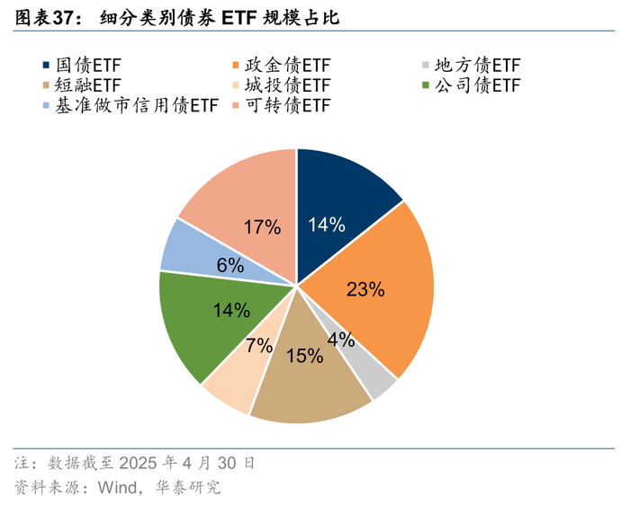 分类型来看,截至2025年4月30日,利率债ETF、信用债ETF与可转债ETF规模占比分别为41%、43%、16%。若进一步将底层资产分类为国债、政金债、地方债、短融、城投债、公司债、基准做市信用债、可转债,各类别ETF规模规模占比分别为14%、23%、4%、15%、7%、14%、6%以及17%,其中政金债规模占比最高、可转债紧随其后。