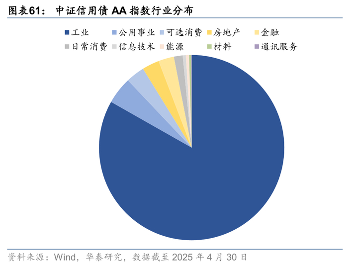 行业分布方面,鉴于基准做市场信用债成分券以AAA级为主,故其与AAA普通信用债指数成分券无明显区别,均以工业为主,占比在50%上下。此外还涉及公用事业、金融、材料、信息技术、消费(可选&日常)、能源等行业。为数不多的区别是,上交所基准做市信用债成分券中能源行业占比较高,近30%。深交所基准做市信用债、普通信用债成分券中能源行业占比仅不到5%。与AAA级信用债指数成分券相比,AA级信用债行业分布更为集中,83%以上为工业企业。