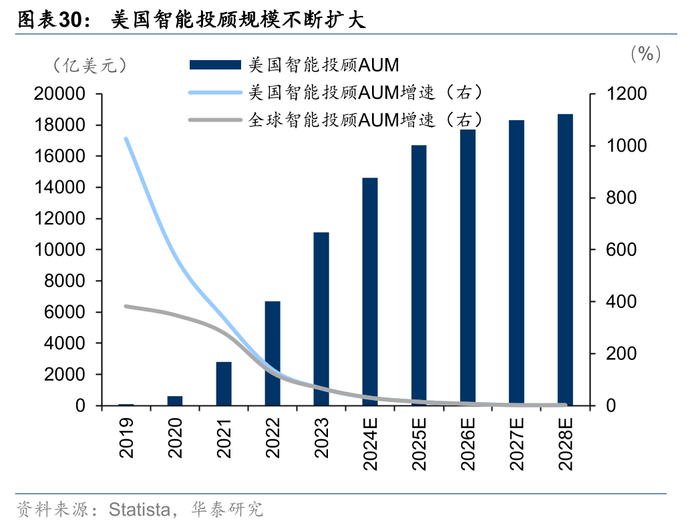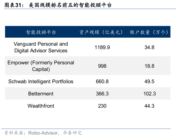 随着信息技术的发展,金融行业加速创新迭代,智能投顾行业迎来迅速增长。美国典型智能投顾平台投资标的大部分为ETF,智能投顾行业的增长给ETF带来了增量资金。此外,为了进一步提升FOF的流动性与透明度、降低基金费率,越来越多FOF管理人选择以ETF作为底层资产。
