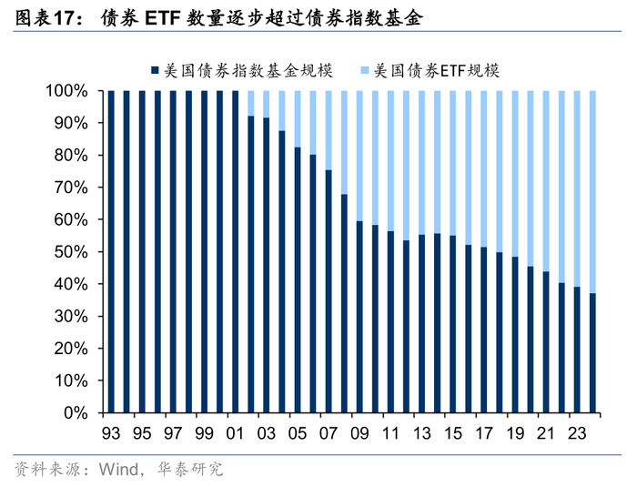 从费用率角度看,指数型债券基金费用率持续下行,且大幅低于主动管理基金。以美国为例,2000年以来美国共同基金的费用率持续下降,其中债券指数基金费用率由1996年的0.21%下降至2023年的0.05%,且低于主动管理的债券基金超40bp。基金费用率下降有几个方面的原因:一是平均每只基金的规模逐步扩大,摊薄了基金的固定成本支出;二是更多投资转向购买没有载入费用的基金(No-Load Funds),即在购买或赎回时无需支付销售费用;三是基金市场扩张带来的规模经济,以及资管公司之间的竞争带来的成本降低;四是投资者开始更加关注成本,倾向于选择费率更低的产品。