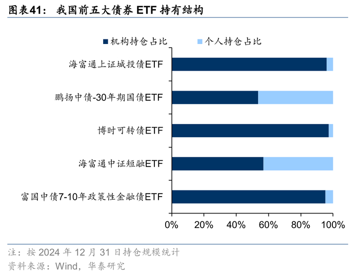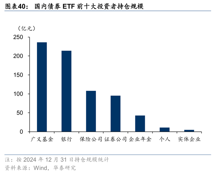 我国债券ETF主要被机构投资者持有,机构中以券商、保险公司、广义基金、银行为主。根据2024年年报数据,统计已披露的债券ETF持仓结构可以发现,机构投资者持仓占比超86%。细分来看,在前十大持有人中,广义基金总计持有超236亿元,占比最高;银行次之,规模约214亿;保险公司规模约108亿元;证券公司规模约95亿元。