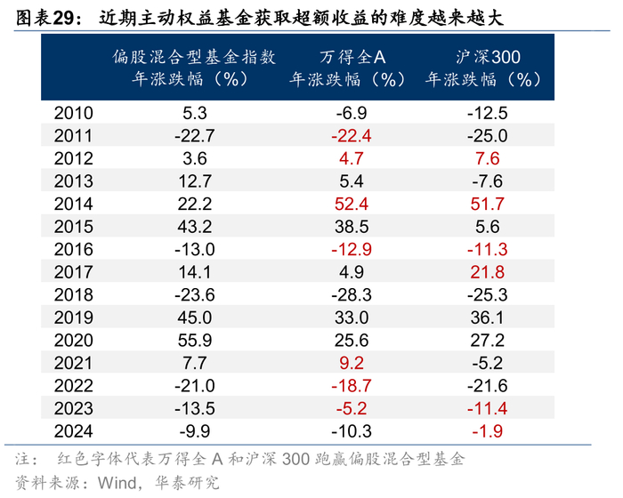 近期我国主动权益基金获得超额收益难度越来越大,发展ETF或可成为破局之路。以偏股混合型基金指数作为主动权益基金代表,万得全A和沪深300分别代表A股全市场与大盘,可以发现2010年来主动权益基金明显跑赢大盘和全市场,中国主动权益基金总体来说尚能获取超额收益。但考虑到有效市场假说下,主动基金难以在有效的资本市场获取超额收益,随着我国资本市场逐步完善,主动投资策略或难以持续跑赢市场,被动投资策略获更有优势。观察到近几年来偏股混合型基金指数跑输大盘和全市场的概率有所上升,即近期主动权益基金获取超额收益难度越来越大,发展被动投资或已成占优选择。