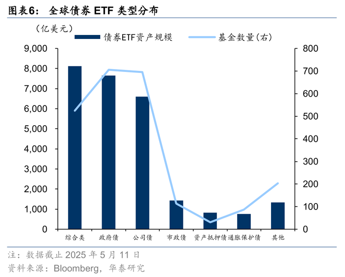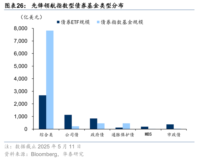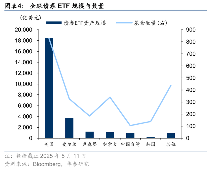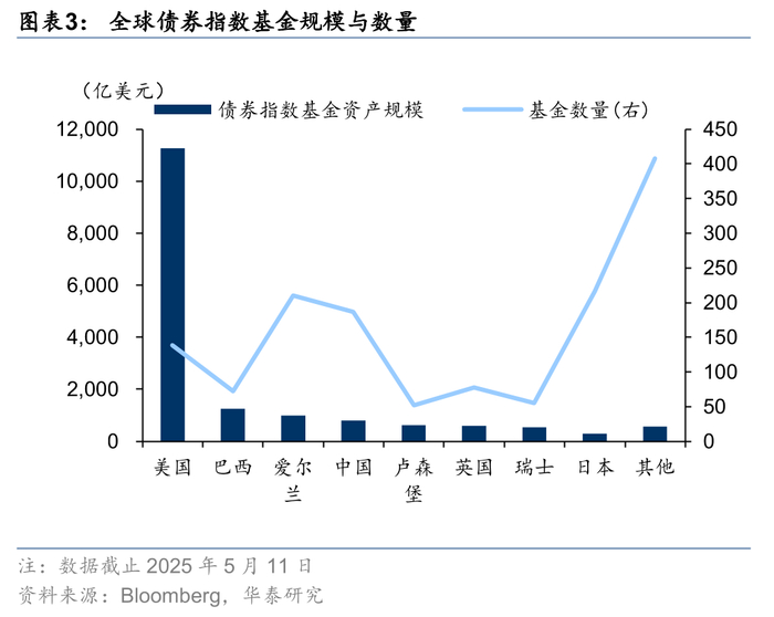 海外指数型债券基金规模较大,美国占比超半数。根据彭博数据,截止2025年5月11日,全球共有1400余只债券指数基金和2300余只债券ETF。债券指数基金规模达到1.7万亿美元,债券ETF规模达到约2.6万亿美元。从市场格局看,美国被动型债券指数基金发展相对成熟,债券指数基金规模达到1.1万亿美元,占全球总规模66%以上,债券ETF规模1.8万亿美元,占全球近70%。其他主要市场还包括巴西、爱尔兰、英国、卢森堡等国家。