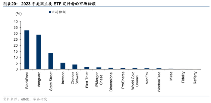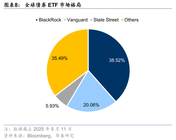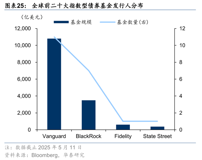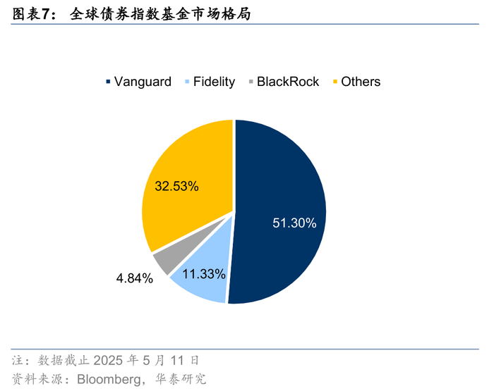 从市场格局看,被动型债券指数基金头部效应明显,行业格局稳定。在债券指数基金领域,头部公司包括Vanguard(市场份额51%)、Fidelity(11%)、BlackRock(5%),前三家公司总计市场规模达到近70%。在债券ETF领域,头部公司包括BlackRock(市场份额39%)、Vanguard(20%)、State Street(6%),前三家市占率达到近七成。其中,Vanguard和BlackRock两家公司管理的指数型债券基金规模约1.57万亿美元,占全球总规模的59%,头部效应明显。