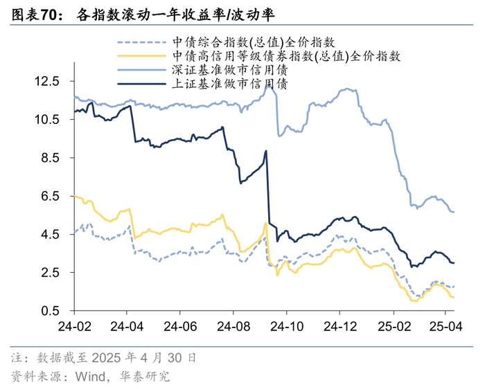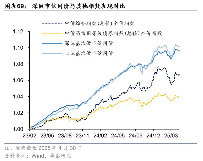 进一步比较基准做市公司债指数与中债综合指数(总值)全价指数和中债高信用等级债券指数(总值)表现,可以看到基准做市公司债指数自做市以来涨幅领先。以上交所2023年2月6日正式启动债券做市业务作为基准日,截至2025年4月30日,中债综合指数(总值)全价指数上涨6.8%,中债高信用等级债券指数(总值)全价指数上涨3.9%,而上证、深证基准做市公司债指数涨幅分别达9.6%、10.2%。此外,从滚动1年的收益率/波动率看,基准做市公司债指数大部分明显高于其他两类指数。