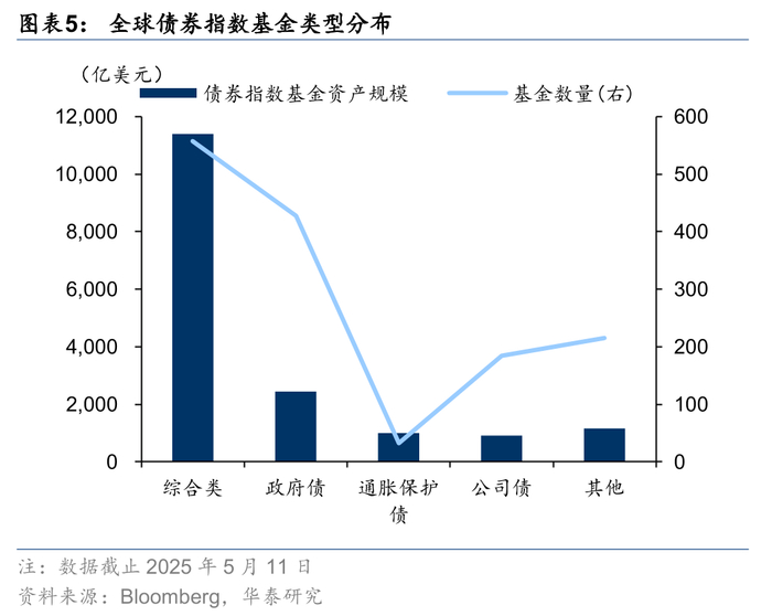 从投资策略看,全球被动型指数债基主要投资于综合类债券、政府债和公司债。全球债券指数基金以综合类债基为主,规模约1.14万亿美元,占全部债券指数基金规模的72%,总计约557只。债券ETF投资策略相对更加丰富,包含了综合类(8100亿美元)、政府债类(7600亿美元)、公司债类(6600亿美元),以及市政债、通胀保护债、MBS等底层资产类型。