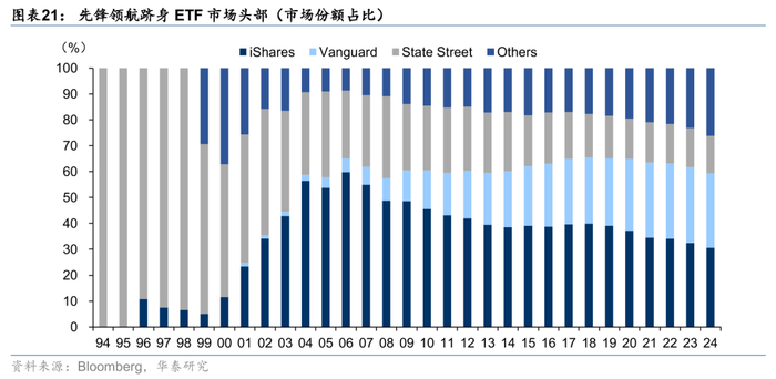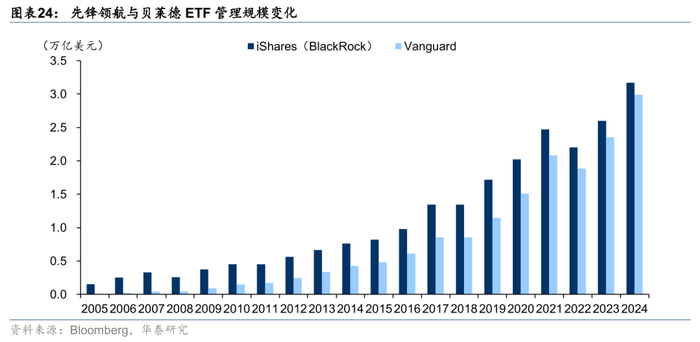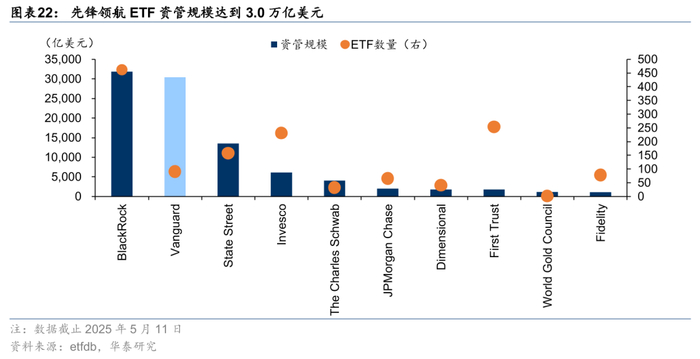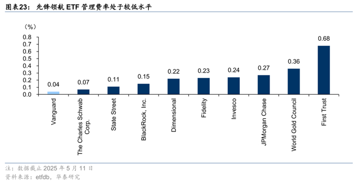 在被动投资高速发展阶段,先锋领航再次凭借低费率跻身ETF市场头部。在ETF发展阶段,先锋起步较晚,但是利用自身在指数方面累计的客户资源以及低费率策略,先锋的ETF业务迅速成长,且呈现出继续增长的趋势。至2023年,先锋已经成为ETF头部企业,与贝莱德、环球道富一起,管理了ETF市场近80%的市值。截止2025年5月,先锋领航ETF管理规模达到3.0万亿美元,仅次于贝莱德,居全球第二。先锋领航费用率在主要ETF资管公司中是最低的,仅为0.04%,比贝莱德低约11bp。