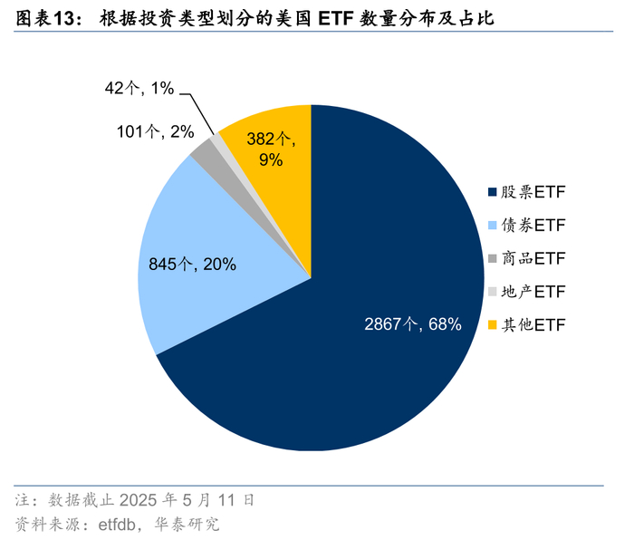 美国ETF市场是全球规模最大、流动性最佳、机制最成熟的ETF市场,债券ETF为仅次于股票ETF的第二大品类。截至2025年5月11日,美国ETF市场规模已超过10.7万亿美元,数量为3985个。结构来看,美国ETF市场以股票ETF为主,规模占全ETF市场将近八成,债券ETF规模占全ETF市场将近两成。此外,还有地产ETF、商品ETF、货币ETF、跨资产ETF、优先股ETF、另类ETF等多种产品,为投资者提供了丰富的选择。