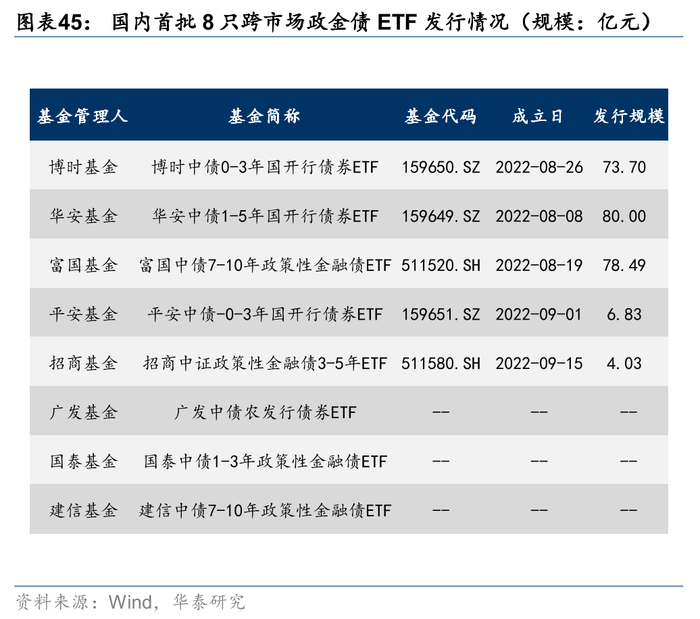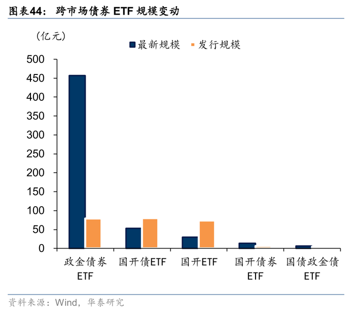 2022年是我国跨市场政金债ETF发行元年,首批有8只跨市场政金债ETF获批,5只发行落地。首批包括华安、博时、富国、平安、广发、建信、招商和国泰总计8家基金公司获得发行政金债ETF资格。最终,有5只跨市场政金债ETF发行落地,分别由富国、招商、华安、博时、平安基金发行。截止2025年4月30日,跨市场债券ETF总规模为558亿元,占全部债券ETF总规模约27%。