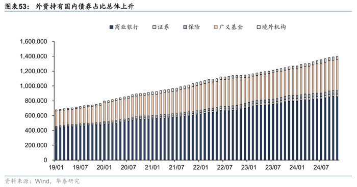 第三,外资更习惯于用债券ETF进行投资。伴随着中国债市对外开放的推进,外资在中国债市的占比有所提升,成为中国债市的重要参与主体。根据托管数据,2014年以来,外资持债占比呈现先快速上升,后小幅回落至稳定比例的状态,外资持债占比由2014年1月的1.36%上行至2021年6月的3.82%,随后逐渐回落并平稳波动,截止2024年12月,外资持有国内债券占比达到2.6%。由于海外投资者非常习惯于用债券ETF进行投资,也需要相关工具类产品的开发。