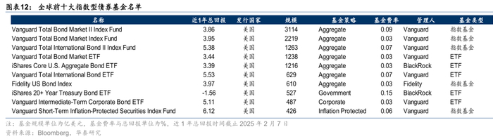 在全球头部指数型债券基金中,债券ETF呈现出小而全的特征。在全球前二十大指数型债券基金中,包含14只债券ETF,6只债券指数基金。债券ETF种类包含了综合类、政府债、公司债、市政债、通胀保护债等,可以满足投资者多样化的配置需求。但债券ETF的平均规模较小,约519亿美元,而债券指数基金的平均规模达到1334亿美元。由于债券ETF底层资产更加多样且规模较小,不同ETF之间的收益率差异较大。