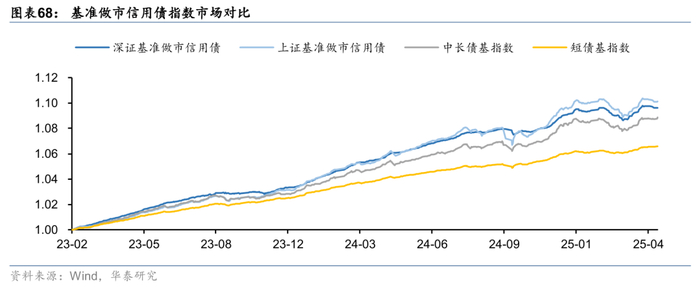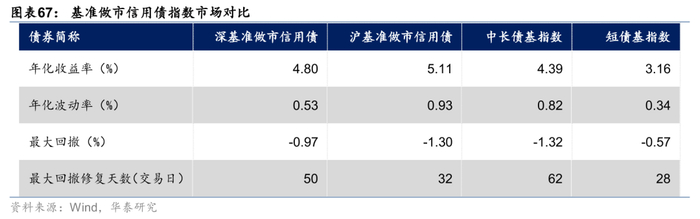 第四,基准做市信用债指数具备较好的历史收益表现。截至2025年4月30日,2022年6月以来沪做市公司债指数与深做市信用债指数年化收益分别达5.11%、4.80%,受益于更强的流动性及偏长的久期,基准做市信用债指数的收益表现均好于同期中长债基金指数。且在历次指数下跌中回撤幅度相对更小、回撤修复更快、抗跌性更强。比如24年8月信用债尤其是长久期品种出现超调,指数亦出现一定的波动,但在后续的修复行情中,基准做市信用债指数的恢复表现整体也好于中长债基金指数。