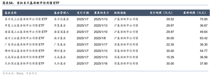 2025年1月7日,8只基准做市信用债ETF分别于上交所和深交所集体上市发售,每家募集上限为30亿。随后多只产品提前结束募集,多数产品达到或接近30亿元的募集上限,募集总规模达217亿元。截至2025年4月30日,首批8只基准做市信用债ETF最新合计规模达391亿,较最初募集总规模增幅超过80%。