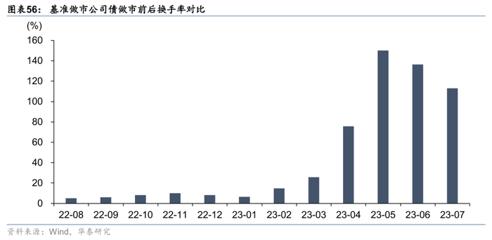 最直观的体现是标的债券换手率的跃升。2000年4月,中国人民银行在《全国银行间债券市场债券交易管理办法》中首次提出“双边报价商”的概念,做市商制度由此在我国银行间债券市场萌芽。2007年《全国银行间债券市场做市商管理规定》发布,做市商制度在我国银行间市场正式率先实施。直至2023年2月,沪深交易所债券做市业务正式上线,交易所做市业务的空白终于得以填充,首批共有12家证券公司参与做市。据深交所2023年3月披露数据,做市业务开通后首月做市券日均成交金额近8亿元,较做市启动前增长34%,占现券日均成交量的比例达到8%。进一步,我们以做市公司债换手率来衡量(成交量/余额)流动性,以展业首日为起点、前后各取半年时间为窗口期(至窗口期末首批基准做市公司债仍在池的还有23只),可以看到标的债券换手率在做市业务推出后跃升超20倍。