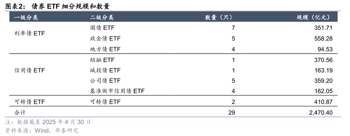 截至2025年4月30日,全市场共有29只债券ETF,基金规模总计约2470亿元。单只规模超过300亿的债券ETF有3只,分别为短融ETF、可转债ETF与政金债券ETF。