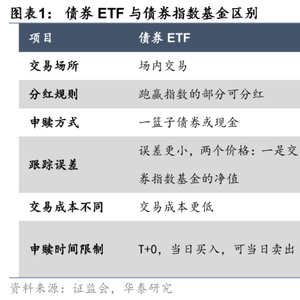 当ETF跟踪的标的为债券指数时,则此类ETF为债券ETF。然而,我们可以通过交易场所、分红规则、申赎方式等方面对比债券ETF和普通的债券指数基金的区别,详见下表: