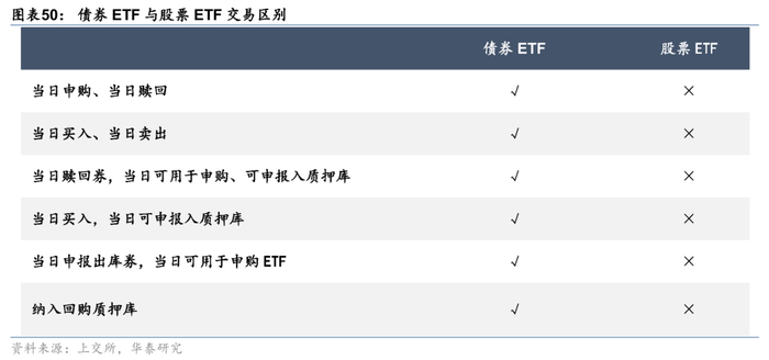 债券ETF交易便捷、申赎高效。根据《上海证券交易所交易规则(2023年修订)》的规定,债券ETF可实现“T+0”交易,即当日买入、当日可卖出,且债券ETF在二级市场卖出后资金当日可用,次日可取。除二级市场交易可实现“T+0”买卖外,沪深交易所单市场债券ETF还可实现“T+0”申赎,即:当日申购的债券ETF当日可赎回得到“一篮子债券”;当日赎回得到的“一篮子债券”当日也可用于申购债券ETF。