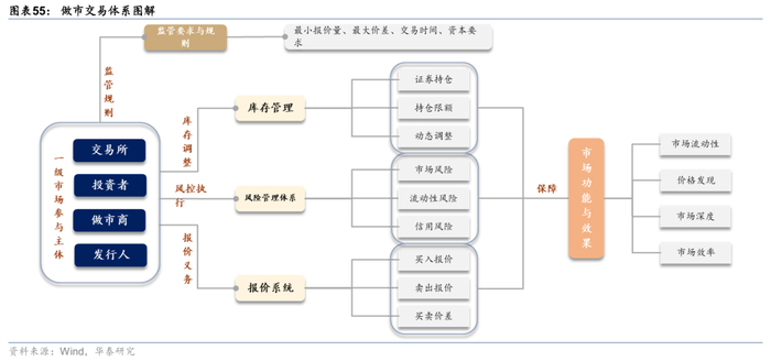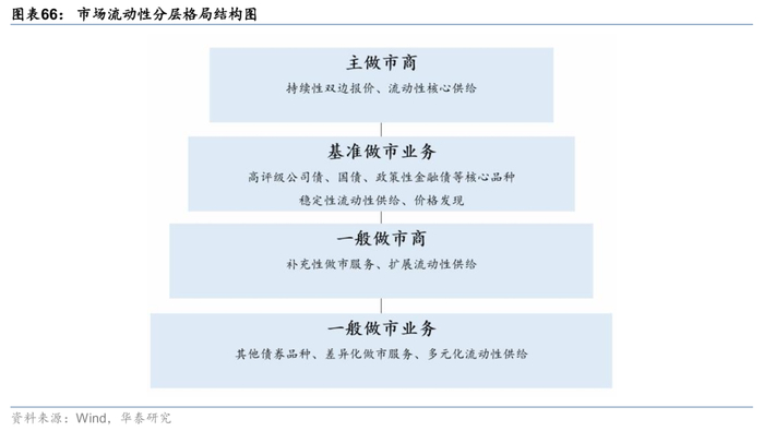 第三,基准做市与一般做市有什么区别?一方面是做市商有别,债券做市商分为主做市商和一般做市商,对应债券做市业务也被分为基准做市业务和一般做市业务。其中主做市商可以同时开展基准做市和一般做市业务,一般做市商只能开展一般做市业务。另一方面是做市品种的差异,基准做市业务的标的范围是基准做市债项清单,正如上文所述,集中于高评级、高流动性的品类。一般做市业务即基准做市清单之外的品类。截至2025年4月30日,上交所利率债基准做市品种共73只、利率债一般做市品种共226只,信用债基准做市品种共214只、信用债一般做市品种共572只。深交所利率债基准做市品种75只、一般做市品种44只,信用债基准做市品种221只、一般做市品种25只。