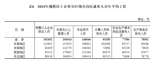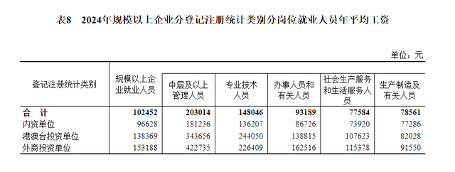 其中,中层及以上管理人员203014元,增长2.4%;专业技术人员148046元,增长5.0%;办事人员和有关人员93189元,增长4.1%;社会生产服务和生活服务人员77584元,增长3.1%;生产制造及有关人员78561元,增长4.1%。