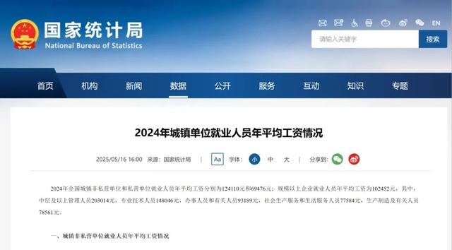 5月16日,国家统计局发布2024年城镇单位就业人员年平均工资情况。