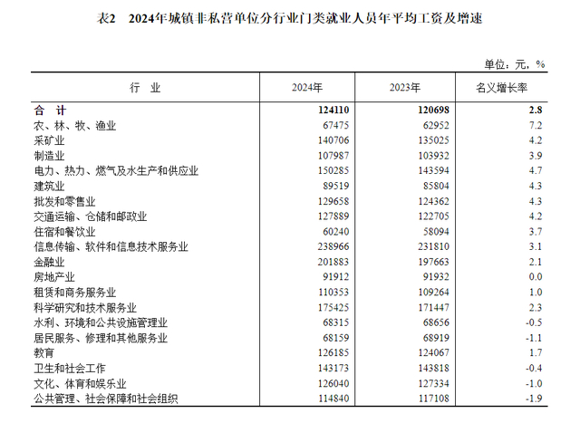 国家统计局16日公布数据显示,2024年全国城镇非私营单位和私营单位就业人员年平均工资分别为124110元和69476元;规模以上企业就业人员年平均工资为102452元。