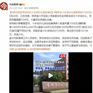 5月20日,江苏无锡,网传宜兴市实验小学家委会和老师联合举办十岁成长礼,班级预算需要7399元,大量网友质疑乱收费。
