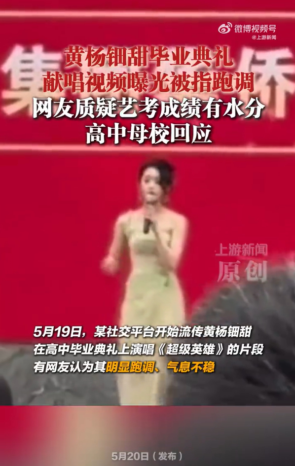 5月19日,某社交平台开始流传其在高中毕业典礼上演唱《超级英雄》的片段。视频中,黄杨钿甜仅演唱两句歌词,不足10秒,有网友认为其明显跑调、气息不稳,质疑其“中戏第二、北电第六”的艺考成绩存在水分。也有网友认为:“黄杨钿甜报考的是表演专业,流行演唱和声乐考试存在本质差异。”