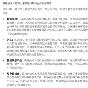 高通公司总裁兼CEO安蒙也对此次合作表示高度期待:“高通和小米一直携手并进,共同打造了众多备受全球消费者青睐的非凡产品。我们非常珍视这一合作伙伴关系,并期待在未来继续携手同行。通过骁龙平台,我们将持续赋能小米的旗舰智能手机,并计划进一步扩展合作领域,涵盖汽车、智能家居、可穿戴设备、AR/VR眼镜、平板电脑等多个领域。”