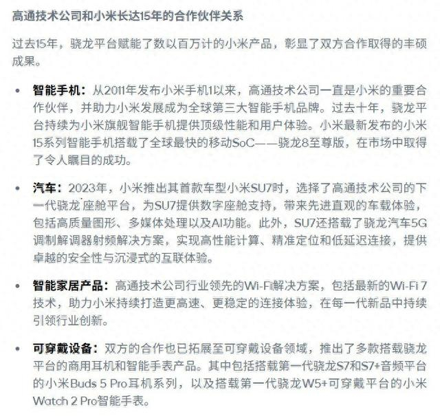 回顾过去15年的合作历程,高通骁龙平台已经赋能了数以百万计的小米产品,共同推动了智能手机行业的快速发展。从2011年小米手机1的发布,到如今小米15系列智能手机搭载的全球最快移动SoC——骁龙8至尊版,双方的合作成果斐然。此外,在汽车领域,小米首款车型小米SU7也选择了高通的下一代骁龙座舱平台,为用户带来了先进直观的车载体验。