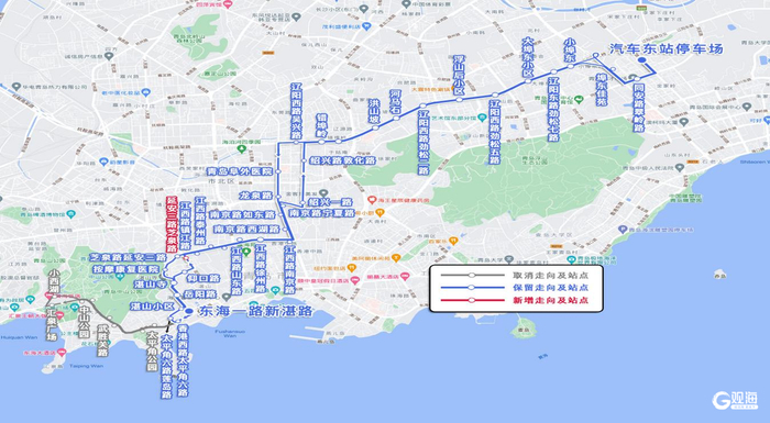 该线路主站汽车东站停车场,副站由小西湖变更为东海一路新湛路,调整后为:汽车东站停车场—东海一路新湛路。