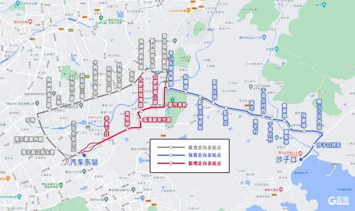 海大崂山校区(并125路)、游云路圣水路(新设)、游云路紫霞路(新设)、金水路松岭路(并387路)、沟崖西(并383路)、海大崂山校区(并383路)。