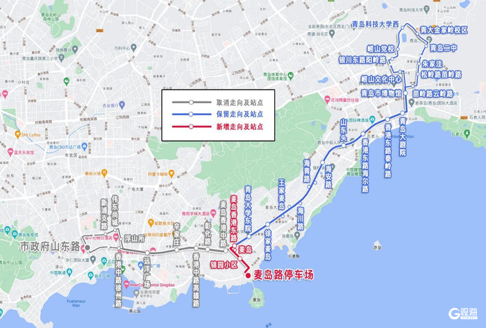 该线路主站由市政府山东路变更为麦岛路停车场,副站青岛科技大学西,调整后为:麦岛路停车场-青岛科技大学西。