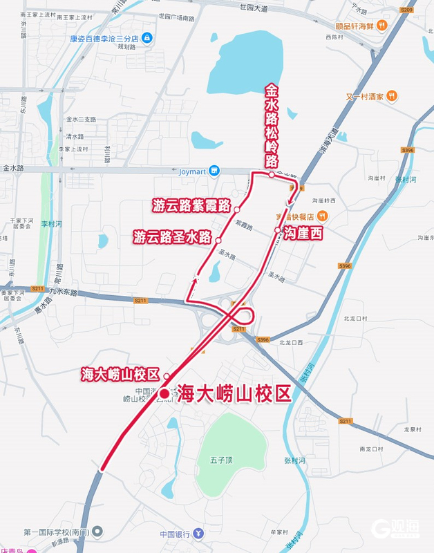 自“海大崂山校区”始发站,沿松岭路、九水东路辅路、九水东路、游云路、金水路、松岭路至海大路口调头折返松岭路至“海大崂山校区”车站止。
