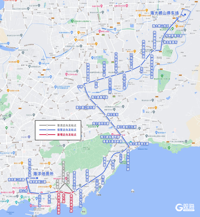 自“海大崂山停车场”始发站,沿原路线至“麦岛香港东路”车站,往返沿香港东路、香港中路至“辛家庄”车站,沿原路线至“海洋地质所”车站止。